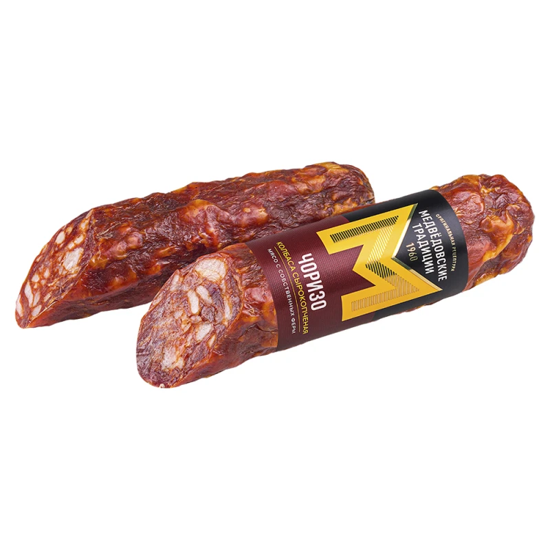 Сырокопчёная колбаса «Чоризо» от бренда «Медведовские Традиции» — настоящий гастрономический шедевр! Приготовленная из отборного мяса , она обладает насыщенным вкусом и ароматом.