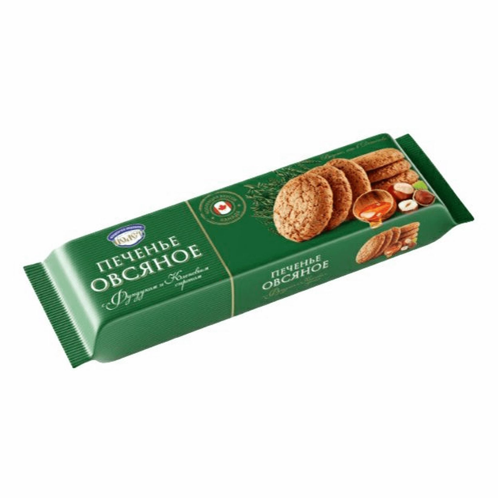 сахар, мука пшеничная в/с, мука овсяная, масла растительные рафинированные дезодорированные, вода питьевая, ядро фундука жареное, изюм, сироп кленовый, разрыхлитель-гидрокарбонат натрия (сода пищевая), соль пищевая, корица молотая, ароматизатор натуральный.